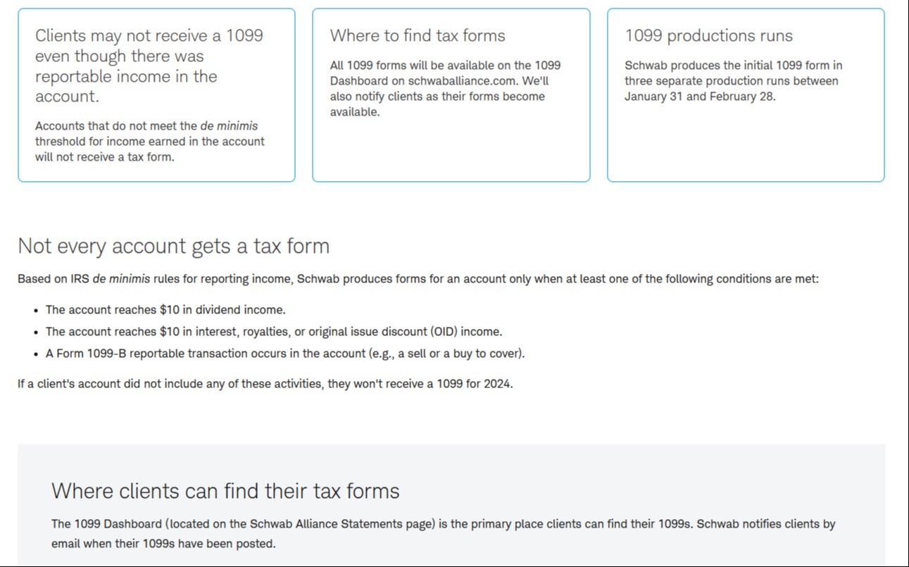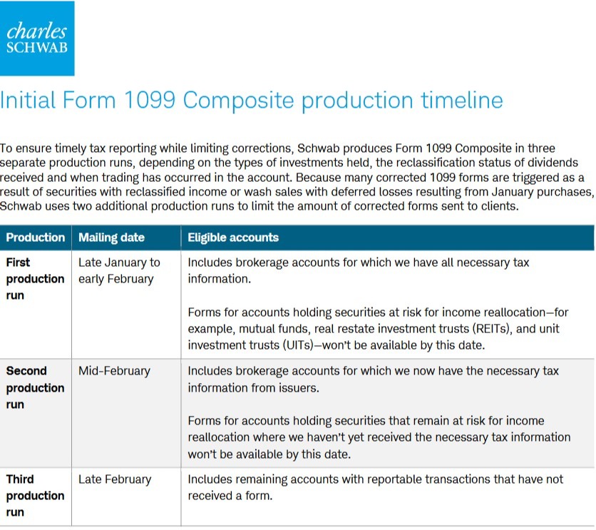 | We hope everyone is having a great week! It's tax season and we are getting inquiries on when Schwab will have tax forms out. The initial 1099 form is produced starting January 31 and runs through February 28th. See additional information below. Tax forms may be found on Schwab.com and also our Client Portal Access under Documents > Custodial Documents > Tax Forms. Let us know if you have any questions or need anything! Sean, Erin, & Trish. |