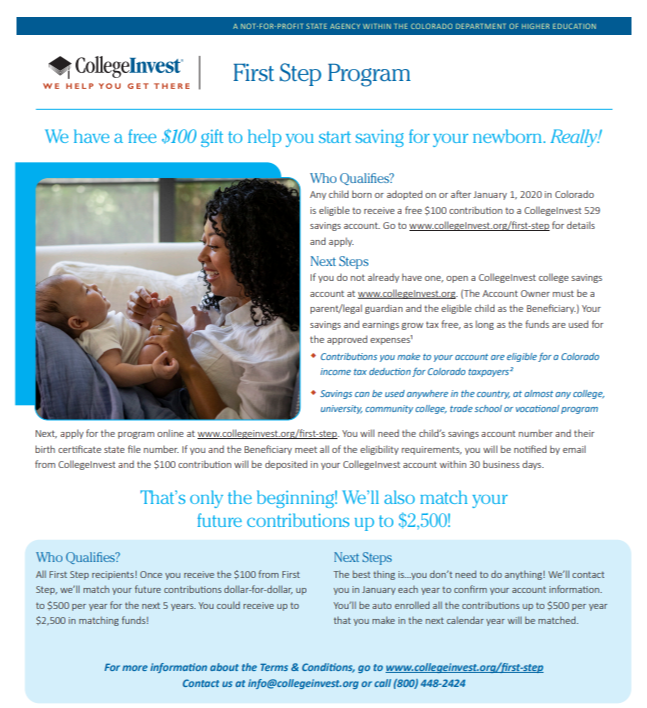 Free Money?!The First Step Program by CollegeInvest is a free jump-start college saving program for every Colorado newborn, made possible by the Colorado legislature through a 2019 bill that created Child Starter Accounts (CSA). Through this program, any Beneficiary born or adopted in the state of Colorado on or after January 1, 2020, will receive a free $100 gift contribution to their CollegeInvest College Savings Account to help them get started on their way to saving for their higher education. And once you get started, they will continue to help! Claim your First Step award by December 31, 2024 and they will match future contributions up to $2,500!Once you receive the $100 from First Step, they will match future contributions dollar-for-dollar, up to $500 per year for the next 5 years. You could receive up to