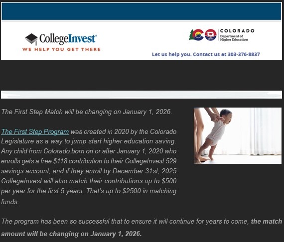 | Changes coming to The First Step Program, designed for college savings (see below). Let us know if you have any questions or need anything else. Have a great week! Sean, Erin, & Trish |